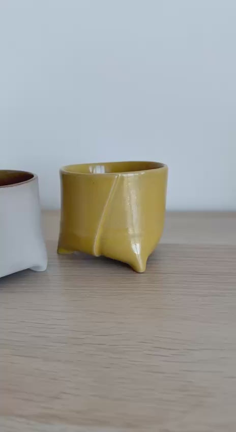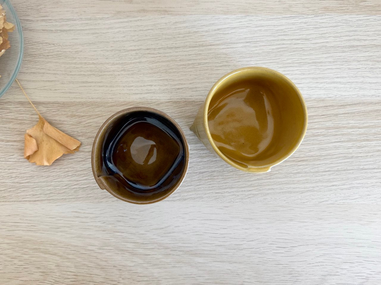 8 oz Yellow Yunomi and 7 oz Amber Yunomi made from stoneware clay and food safe glaze.