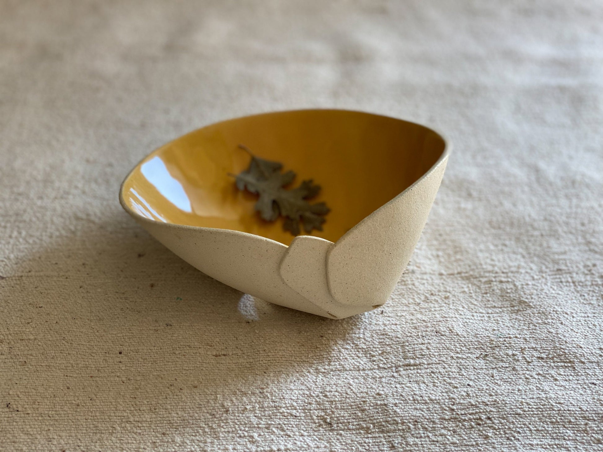 Contemporary decorative and functional bowl made from light beige speckled stoneware and yellow lead-free glaze.